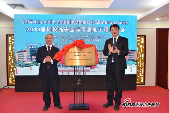 開幕式最后舉行了山東建筑大學(xué)重大基礎(chǔ)設(shè)施安全與可靠度國際研究中心揭牌儀式。張祝秀、陳國前共同為中心揭牌。