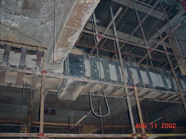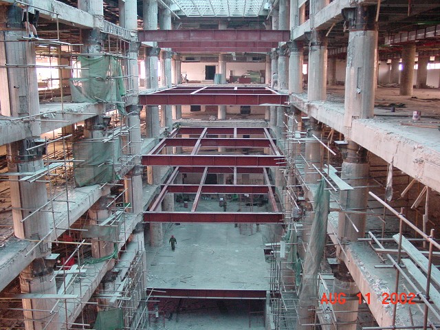 為增加營業(yè)面積,濟南銀座商城八一店采用鋼結(jié)構(gòu)將挑空部分增加五層,圓柱節(jié)點采用化學(xué)植筋結(jié)合粘鋼焊接鋼牛腿方法進(jìn)行加固處理,部分大梁采用包角鋼方法進(jìn)行加固處理,取得了滿意的效果。