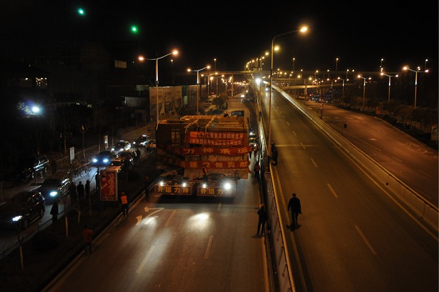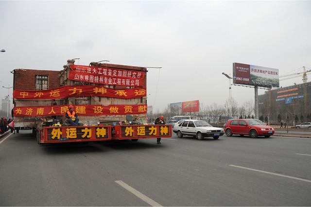 該建筑原位于繁華市區(qū),為了盡量減輕道路交通壓力, 對運(yùn)輸線路進(jìn)行了詳細(xì)勘察,遷移于3月1日21:38分開始,遷移過程中,老別墅四次屈身過街天橋,三過立交,于3月2日11:43安全到達(dá)山東建筑大學(xué)新校區(qū)。整個遷移過程歷時14小時,遷移距離為30公里。