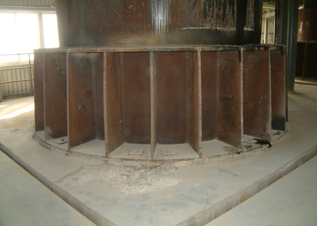 某礦業(yè)公司重燒窯基礎采用鋼筋混凝土框架結構,框架底部為筏板,底標高為-3.50m,其上置方形鋼筋混凝土柱。頂部為一厚1.40m由耐熱混凝土澆筑的平臺,平臺頂面標高為12.00m,中央為一半徑為1.73m的圓孔,重近400t豎窯即通過加肋環(huán)形鋼托盤支撐于平臺圓孔周邊混凝土頂面(圖1)。
