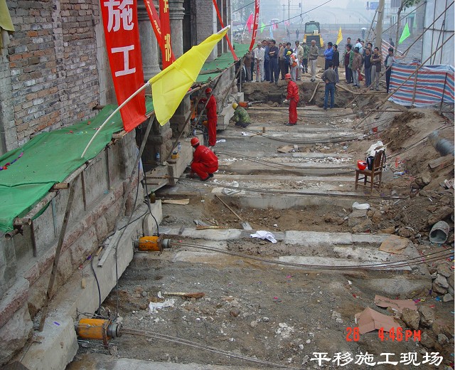 該工程通過墻下雙上軌道梁及鋼滾軸將上部結(jié)構(gòu)托換到下軌道梁上,用多臺同步液壓千斤頂將歷史建筑牽引平移到新位置。