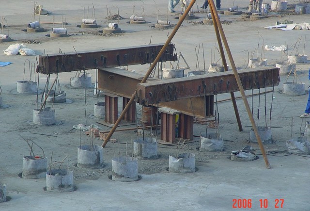 動力施加:     建筑物前后分別由兩臺變頻泵站為千斤頂提供動力,由一臺工業(yè)控制計(jì)算機(jī)通過兩個(gè)PLC控制柜同步控制所有千斤頂。    根據(jù)實(shí)時(shí)監(jiān)測記錄,建筑物啟動時(shí)牽引力為20500kN,約為建筑物總重的1/17.5,正常行走牽引力為10600 kN~13000kN,約為建筑物總重的1/27 ~1/33。 就位連接:     該建筑物平移到位后,墻、柱用連接鋼筋將截?cái)嗝嫔?、下預(yù)埋鋼筋焊接連接。上、下軌道梁之間的空隙用自密實(shí)微膨脹混凝土澆灌密實(shí),保留柱四周的外包梁及墻下?lián)Q梁,上軌道體系的其余部分切除,恢復(fù)地下室的使用功能。