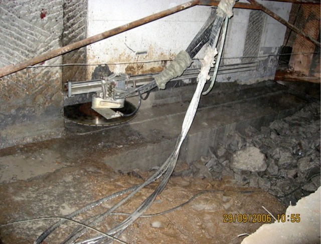 柱截?cái)嗖捎勉@石鏈鋸系統(tǒng);墻體截?cái)嗖捎冒胱詣油七M(jìn)式墻鋸系統(tǒng)。