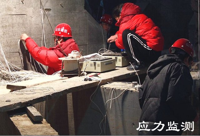 在平移施工前及平移施工過程中,隨時(shí)監(jiān)測托換梁的應(yīng)力及整個(gè)建筑物的沉降、傾斜、振動情況等。