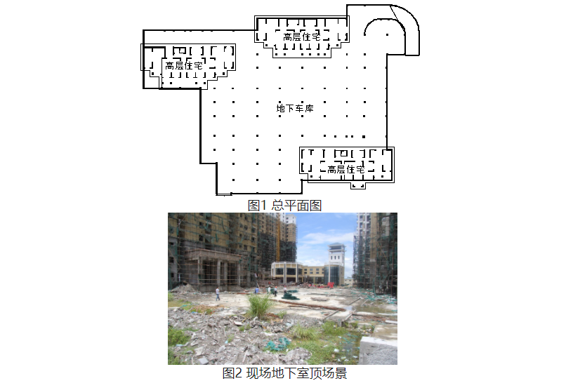 海南某住宅小區(qū),由3棟高層住宅及住宅中間的單層地下車庫組成(圖1、圖2)。三座高層住宅為剪力墻結構,筏板基礎;地下車庫為框架結構,柱下獨立基礎結合防水底板,防水底板為梁板式結構,防水底板與高層筏板間設后澆帶。