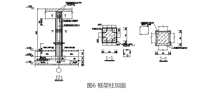 現(xiàn)場檢測發(fā)現(xiàn),車庫上浮導致柱開裂且絕大部分柱產生了受壓區(qū)混凝土壓碎現(xiàn)象,柱發(fā)生受壓破壞,故采用加大截面方法對車庫內55棵框架柱進行加固。原柱每邊外擴10cm,增設豎向鋼筋及箍筋,采用高強免振搗灌漿料澆筑,見圖6。