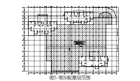 根據建筑完工后總平面中的場地最低點,抗浮設計水頭按4.5m對車庫部分結構進行復核驗算,復核驗算內容包括整體抗浮計算和局部抗浮計算。結合驗算結果及現(xiàn)場檢測情況,在車庫現(xiàn)有地面上增設20cm厚混凝土層,如圖5中陰影所示。