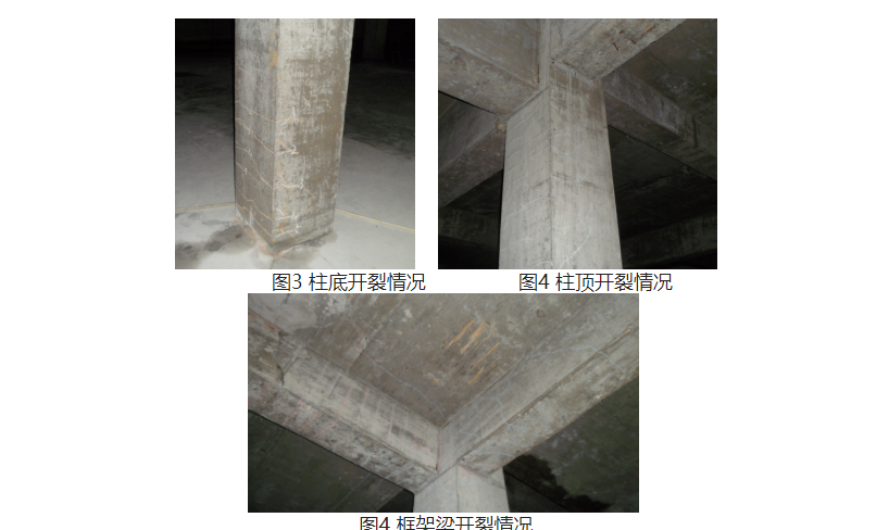 我院技術人員于2013年7月赴現(xiàn)場進行了檢測,檢測結果表明,車庫中心位置上浮位移值最大,上浮后柱底最大高層超過20cm??蚣苤谏细∥灰飘a生的附加軸力及附加彎矩的作用下,產生了開裂及壓碎現(xiàn)象(圖3、圖4)??蚣芰憾藗让娌砍霈F(xiàn)了剪切斜裂縫、梁端底部出現(xiàn)水平裂縫(圖5),特別是車庫與高層住宅交界位置,梁端開裂較為明顯。在車庫頂梁板與車庫外周擋土墻交界位置處附加彎矩的作用下,除梁端裂縫外,擋土墻在梁底標高以下位置出現(xiàn)通長水平裂縫。沿車庫平面跨中位置車庫平面縱向,車庫頂板出現(xiàn)兩條通長裂縫;車庫入口處沿車庫平面橫向,車庫頂板同樣出現(xiàn)兩條通長裂縫,頂板裂縫均與上浮位移較大軸線相對應。