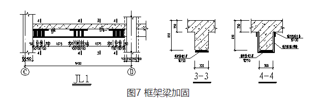 車庫頂梁破壞情況較輕,灌縫后采用粘貼碳纖維加固方法加固,對產生斜裂縫的梁在梁端增設碳纖維U形箍加固,對梁底出現(xiàn)受拉裂縫的梁在梁底粘貼碳纖維加固,見圖7。