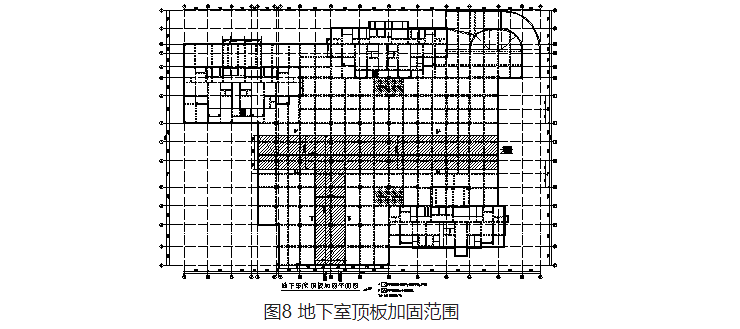 車庫頂板東西向存在兩條通長大裂縫,南北向也有兩條較長裂縫。將裂縫區(qū)域的板加厚10cm,即在板頂增設10cm鋼筋混凝土層,對板進行加固,同時提高梁端截面的承載力,加固范圍見圖8。對底部開裂的板,灌縫后采用粘貼碳纖維方法進行加固。