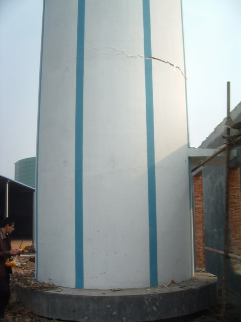 山東金明玻璃纖維有限公司水塔,為鋼筋混凝土倒錐殼水塔,設計采用04S801-2《鋼筋混凝土倒錐殼保溫水塔》中200m3 ,20m高標準圖,實際施工時根據(jù)實際情況高度變?yōu)?5m。支筒采用鋼筋混凝土支筒,半徑(外徑)為1600mm,筒壁厚度為180mm,混凝土采用C30。支筒結構于2007年完工。由于該支筒局部出現(xiàn)裂縫(圖4~6)。
