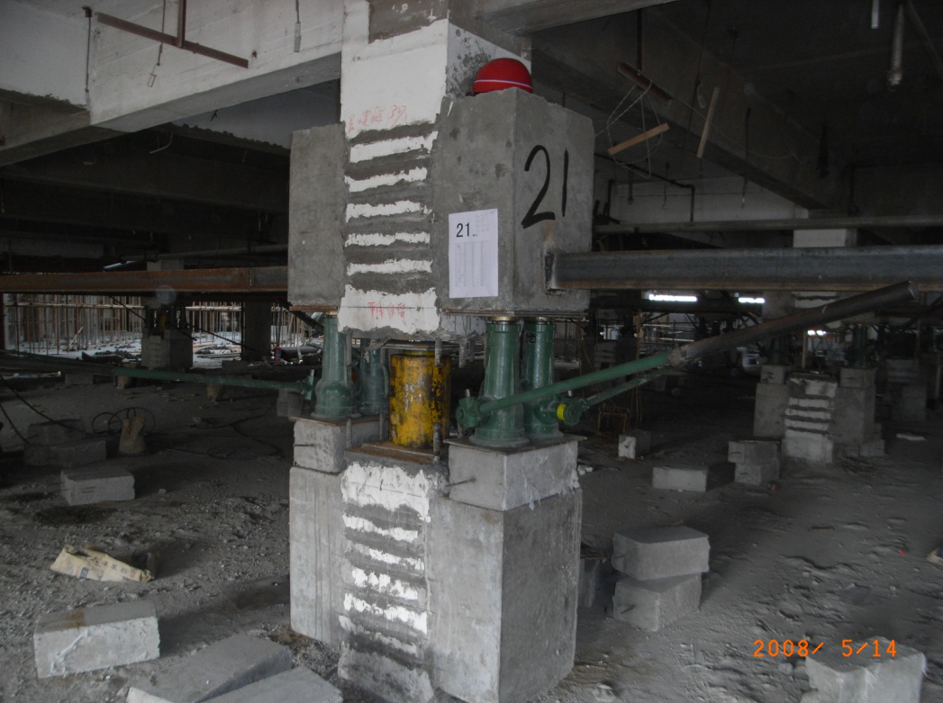 濟寧銀座購物廣場(原濟寧華聯(lián)商廈)二期工程,為五層(局部六層)框架結(jié)構(gòu),建于1992年。該建筑物的四層和五層原設計為倉庫用房,層高為2.9m,面積共計約2500㎡,現(xiàn)業(yè)主單位決定將四層和五層改造成商場經(jīng)營空間,層高不滿足使用要求,委托我公司對四層、五層進行加高改造處理。本著建設節(jié)約型社會、打造精品工程的宗旨,我公司與業(yè)主方研究決定采用整體頂升技術(shù)對四層、五層進行抬升改造,每層抬高1.25m。該工程于2008年4月5日開工,2008年6月15日完工。